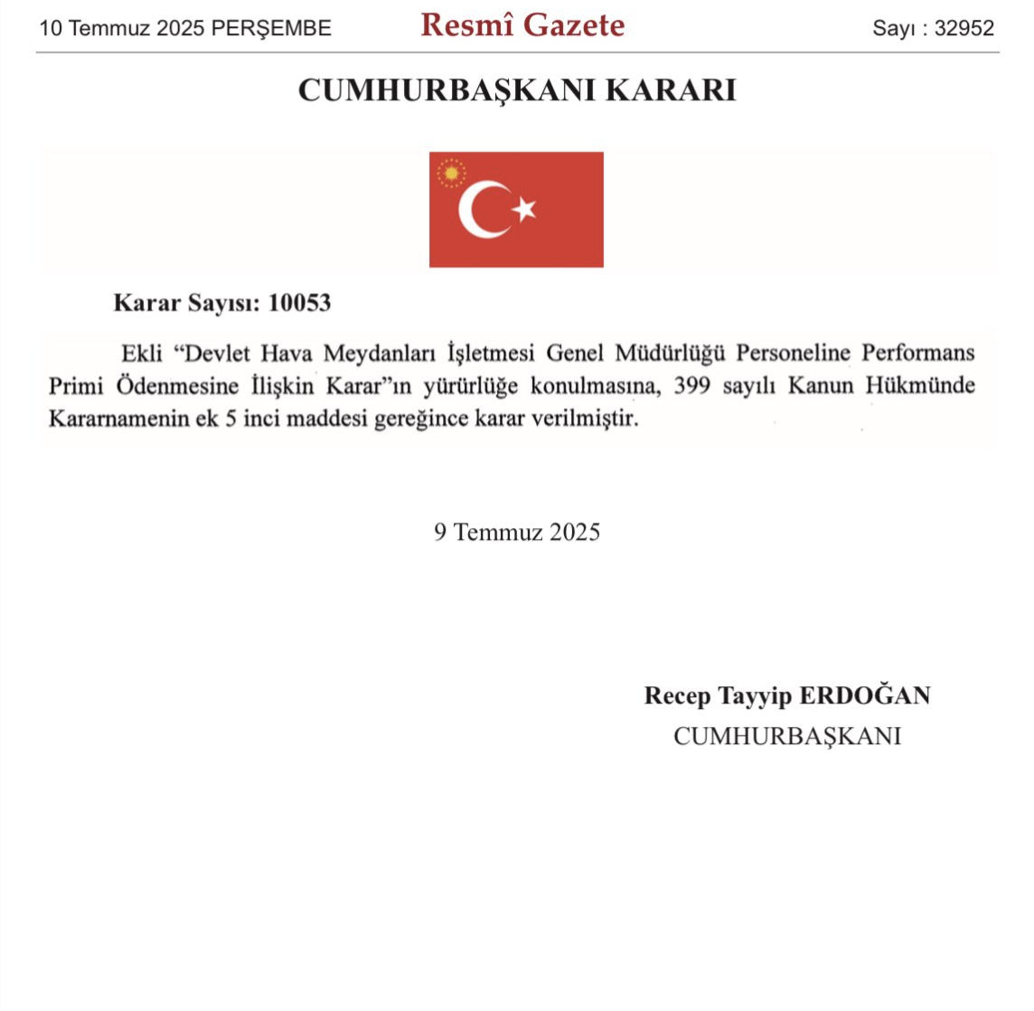 Devlet Hava Meydanları İşletmesi Genel Müdürlüğü Personeline Performans Primi Ödenmesine İlişkin Karar”ın yürürlüğe konulmasına, 399 sayılı Kanun Hükmünde Kararnamenin ek 5 inci maddesi gereğince karar verilmiştir.