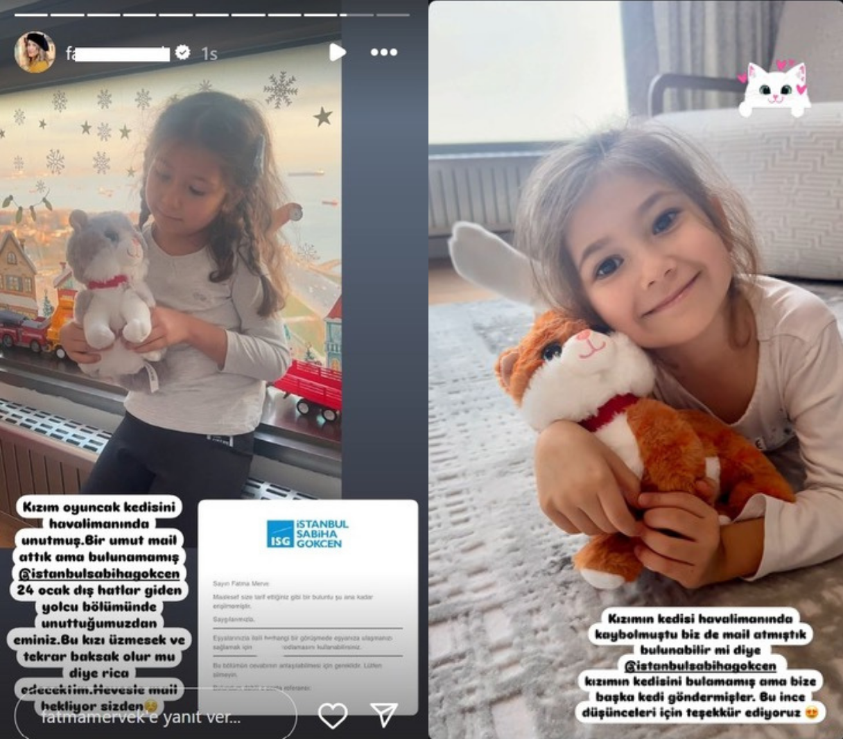 Ailenin SAW Care Çağrı Merkezi’ne yaptığı başvurunun ardından oyuncak bulunamayınca, küçük kızın annesi sosyal medyada İSG’ye seslendi. Bu çağrıya kayıtsız kalmayan yetkililer, küçük kız için özel bir notla birlikte yeni bir oyuncak kedi gönderdi.