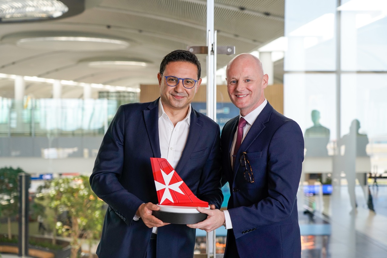 Uçağı İstanbul Havalimanı’nda İGA İstanbul Havalimanı Ticaretten Sorumlu Genel Müdür Yardımcısı Server Aydın ve ekibi karşıladı.KM Malta Airlines Operasyonlardan Sorumlu Genel Müdür Yardımcısı Declan Keller, Server’e havayolunun kuyruk tasarımından oluşan şilti verdi.