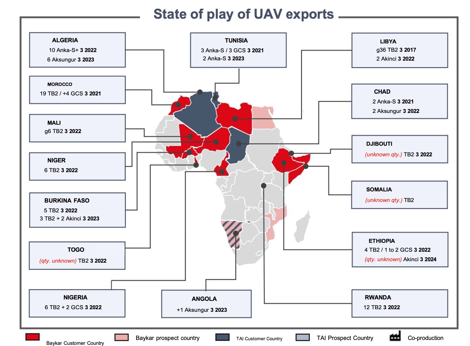 Raporda Afrika konusunda “Kıtadaki müşteri sayısı resmi olarak 15 olmakla birlikte, bu sayının daha yüksek olması ve Angola, Mozambik ve Mısır gibi ülkelerin yakın zamanda TB2’leri edinmeye ilgi duyduklarını ifade etmeleriyle birlikte, potansiyel ülkeler listesinin büyümeye devam etmesi bekleniyor. Halihazırda Türk İHA’larını kullanan ülkelerin de yeni partiler satın alması bekleniyor,” denildi.