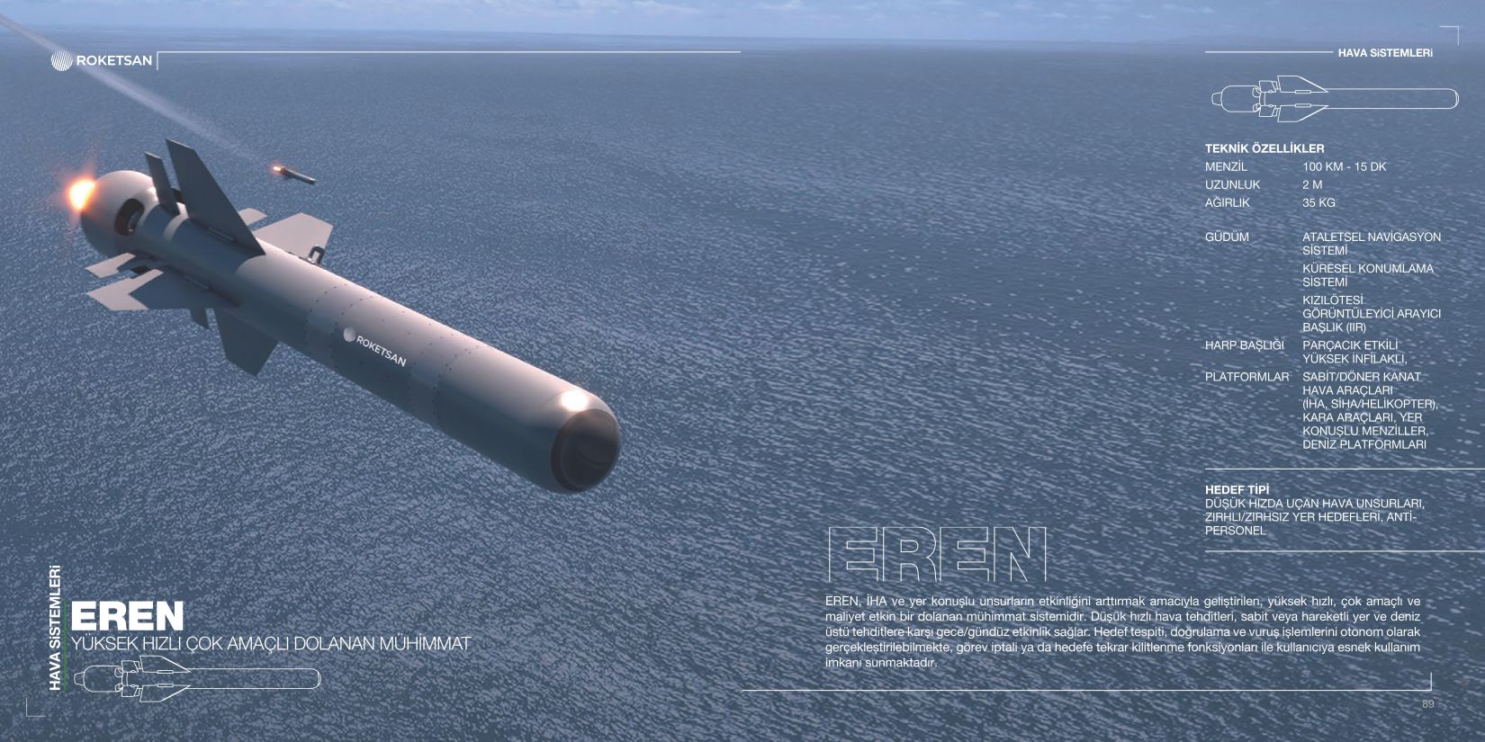 ROKETSAN tarafından yerli ve milli imkanlarla geliştirilen EREN mühimmatının geliştirilen özellikleri ile testi Baykar’ın AKINCI TİHA (Taarruzi İnsansız Hava Aracı) tarafından gerçekleştirildi. Kamikaze drone ve İHA sistemlerinden yere kadar farklı hedefleri vurabilen EREN, farklı özellikleri ile maliyet etkin bir mühimmat olacak.