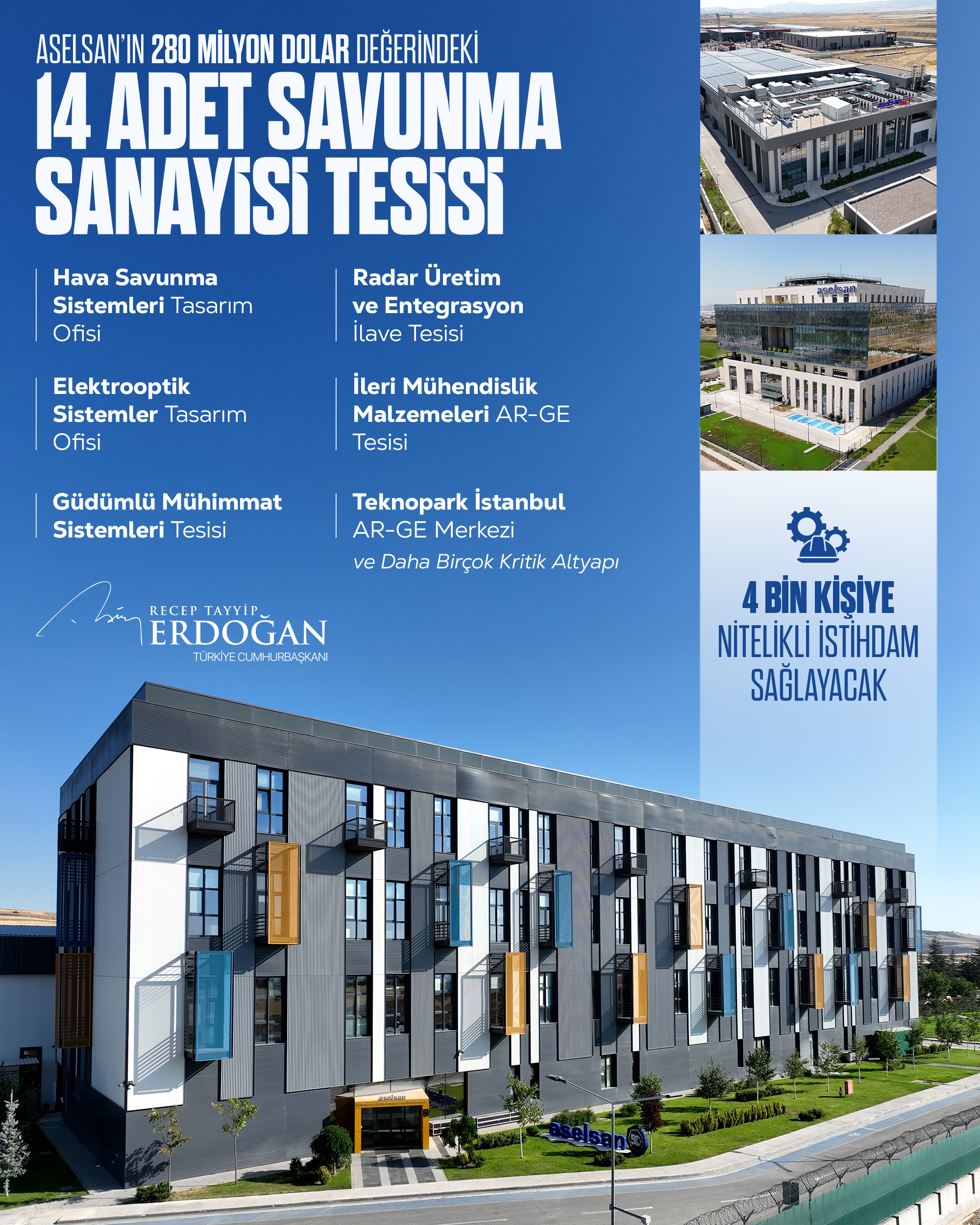 “Bugün açılışını yaptığımız 280 milyon dolar değerindeki 14 tesisle üretim kapasitemizi ciddi şekilde artırıyoruz. Hizmete aldığımız tesisler arasında hava savunma sistemleri tasarım ofisi, radar üretim ve entegrasyon ilave tesisi, ileri mühendislik malzemeler araştırma geliştirme tesisi, elektro optik sistemler tasarım ofisi, güdümlü mühimmat sistemleri tesisi, Teknopark İstanbul Araştırma Geliştirme Merkezi ve daha birçok kritik altyapı bulunuyor. Bu tesisler, yaklaşık 4 bin kişiye nitelikli istihdam sağlama yanında genç mühendislerimize yeni çalışma alanları açacaktır. Bunların da hayırlı uğurlu olmasını diliyorum.