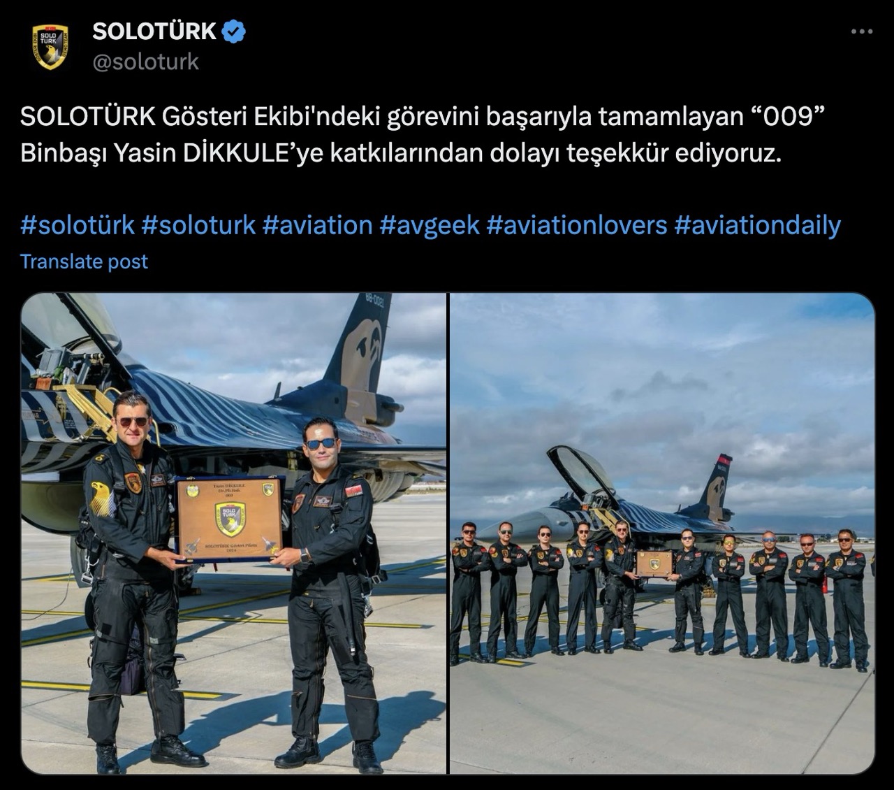 SOLOTÜRK sosyal medyadan yaptığı paylaşımda, “SOLOTÜRK Gösteri Ekibi’ndeki görevini başarıyla tamamlayan “009” Binbaşı Yasin DİKKULE’ye katkılarından dolayı teşekkür ediyoruz” diyerek fotoğraf paylaştı.