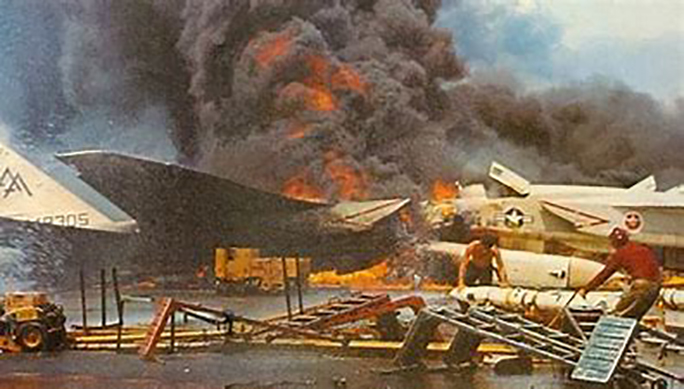 Yangın hızla yayıldı, 32 uçaktan 15’i tamamen imha oldu. Güvertede ağırlıklı olarak F-4J ve A-7 Corsair II’ler vardı.