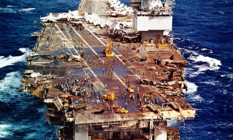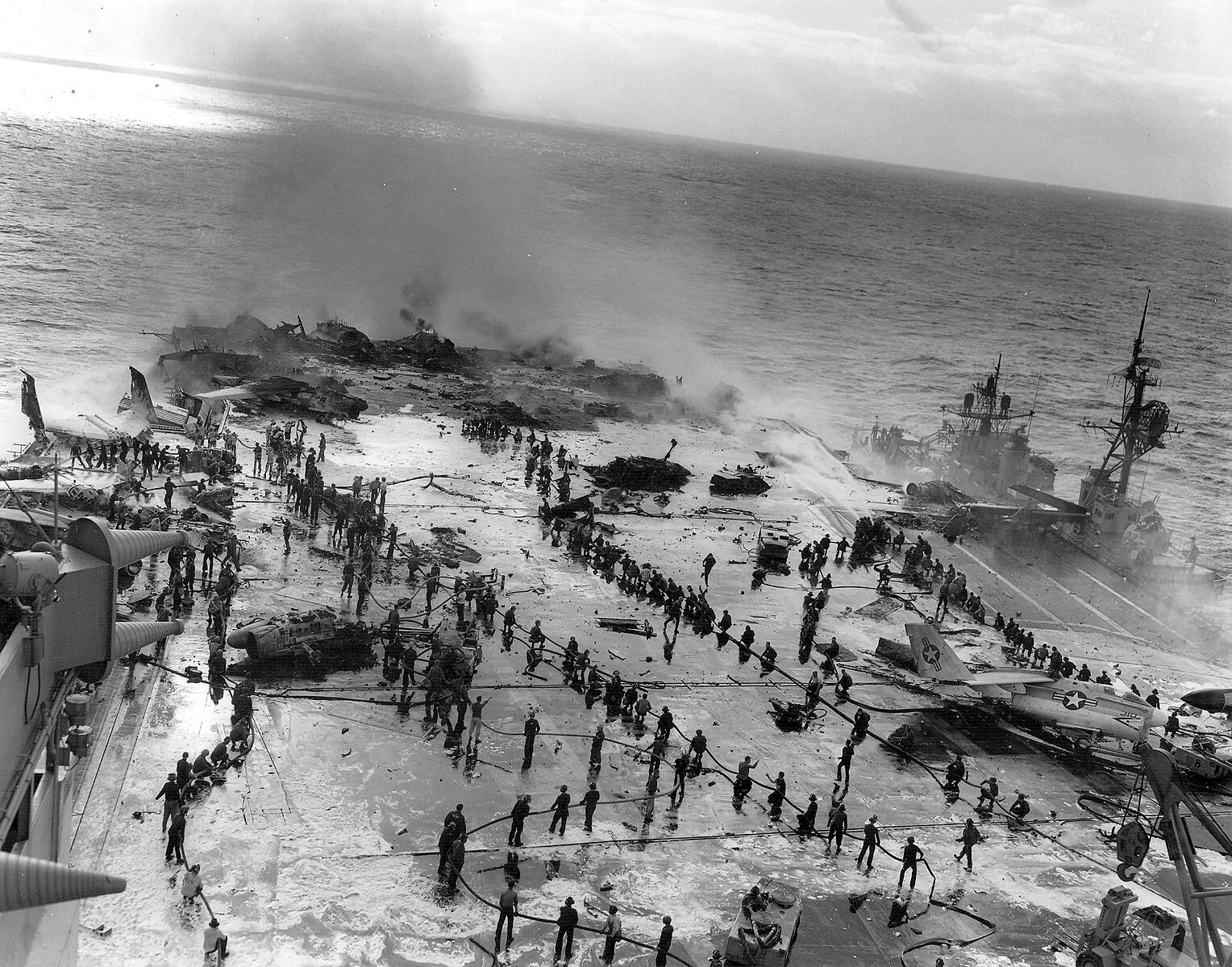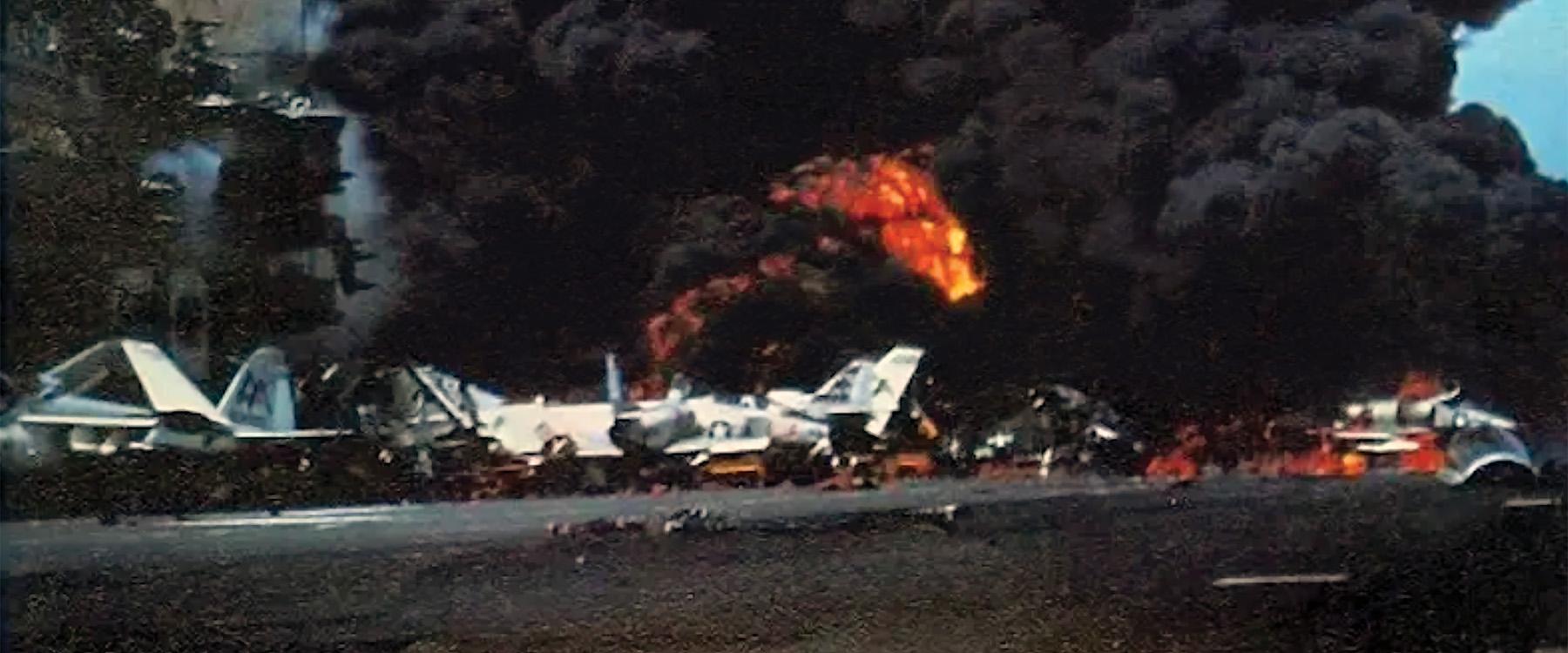 Uçak gemisi, yoğun bir operasyon gününe giriyordu. Uçaklara mühimmat yükleniyor, kalkış için hazırlıklar yapılıyordu. Saatler sabah 08.18’de başlayan infilak, uçak gemisini adeta cehenneme çevirecekti…