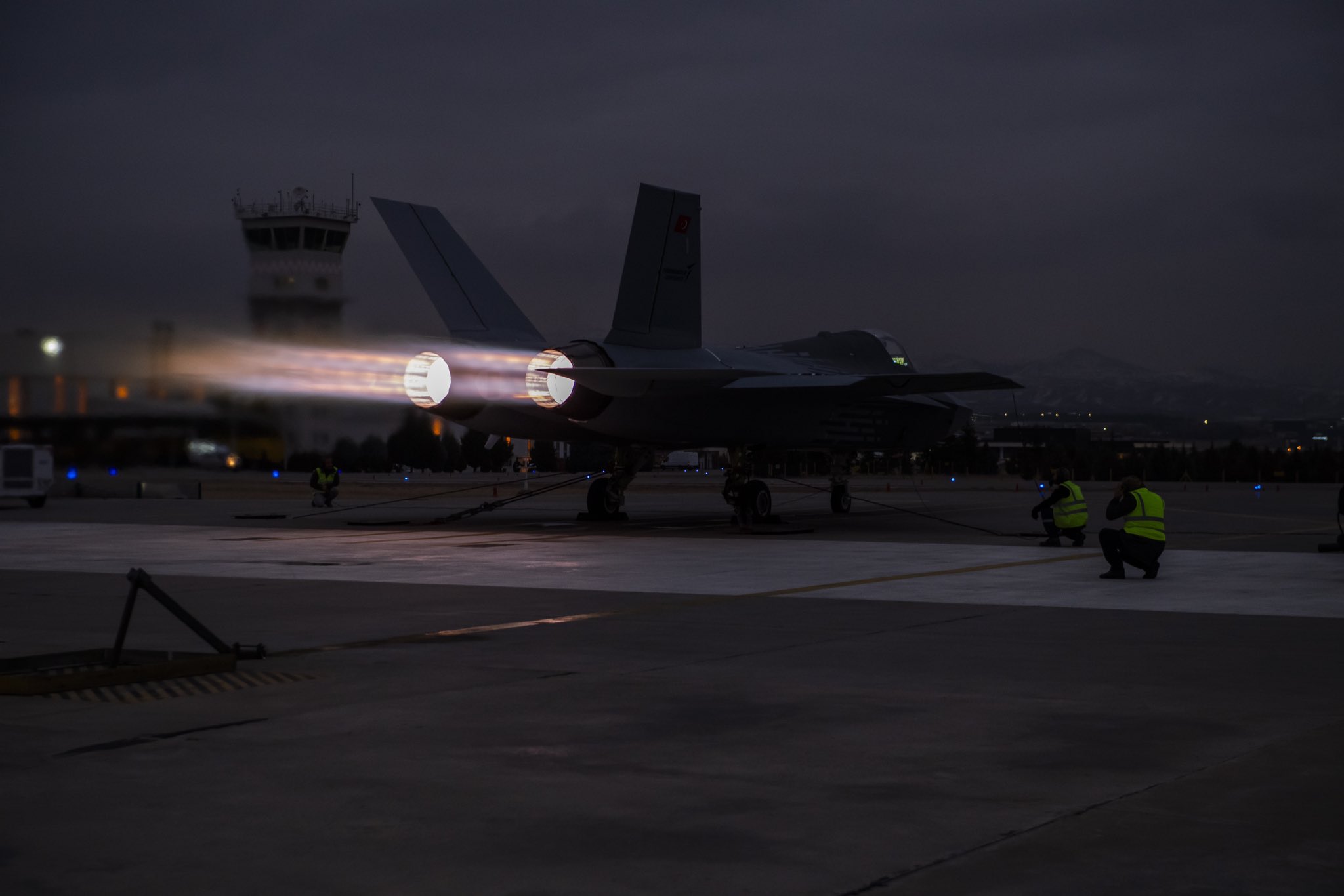 TUSAŞ tesislerinde yer testlerinde uçak iki adet GE Aerospace yapımı F110-GE-129 tipi uçaklarını maksimum güç verecek şekilde çalıştırıldı. Normal devir testlerinden sonra artyakıcı devreye alındı.