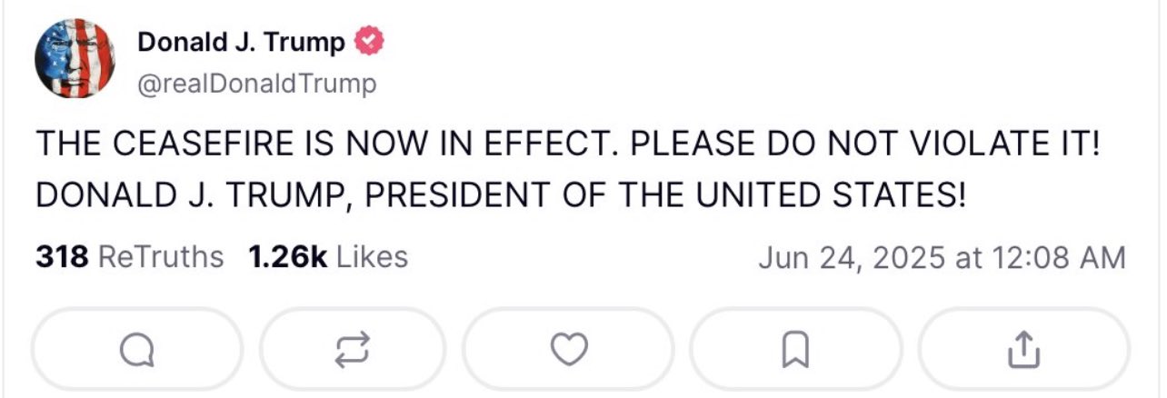 Mesajında Trump,“ATEŞKES YÜRÜRLÜKTE. LÜTFEN İHLAL ETMEYİN.” yazması dikkat çekti.