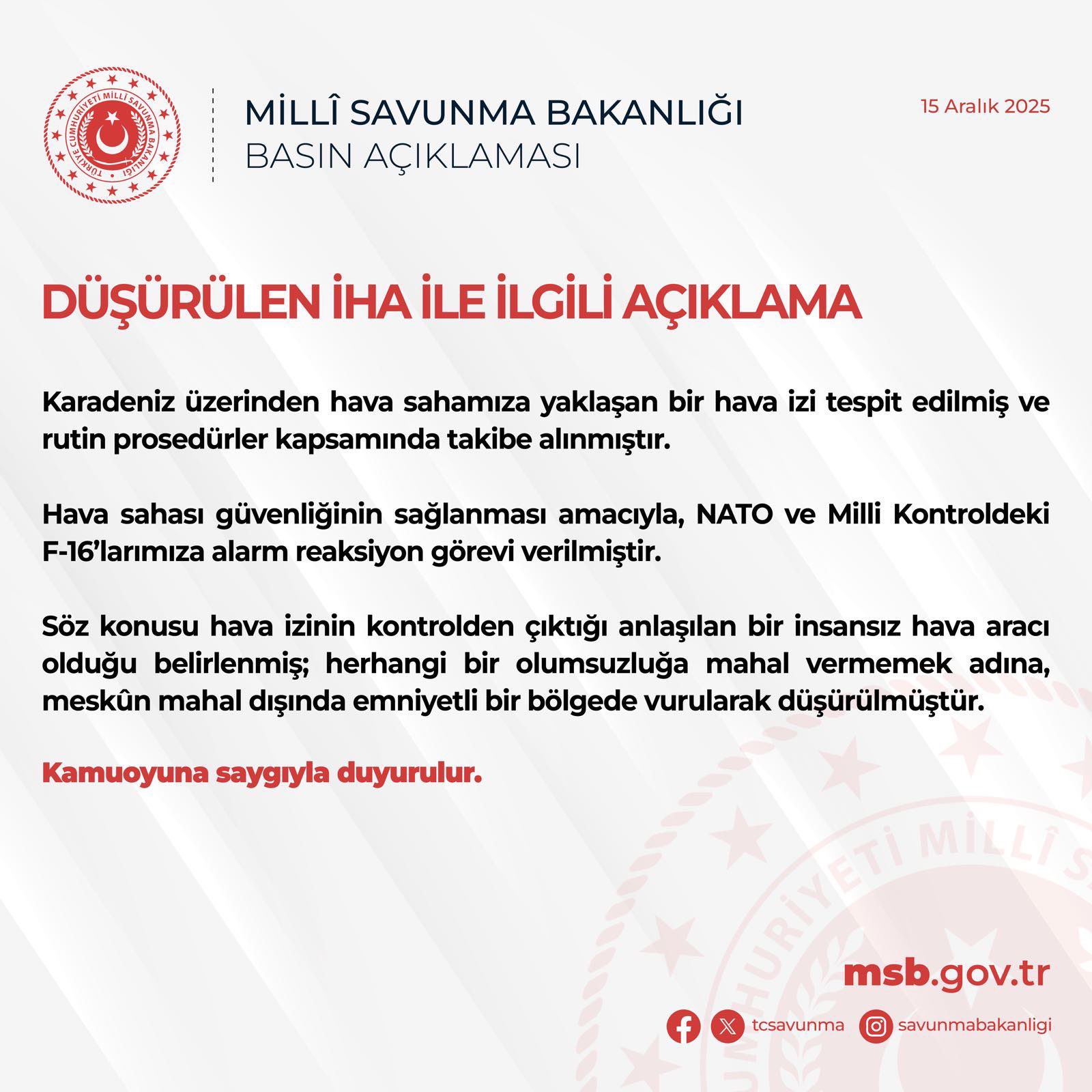 Karadeniz’de hava sahamıza giren kimliği belirsiz İnsansız Hava Aracı (İHA), tedbir amaçlı Türk Hava Kuvvetleri’ne ait F-16 uçakları tarafından düşürüldü.