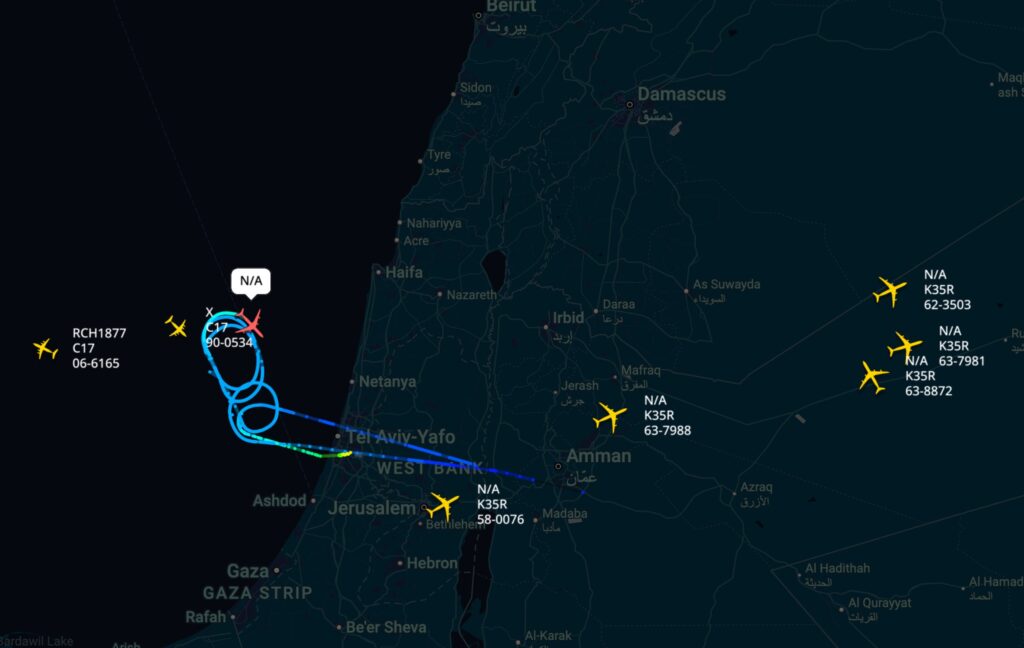 Gece saatlerinde ABD Hava Kuvvetleri’ne ait KC-135 63-8017, İsrail kıyıları açıklarında 7700 Genel Acil Durum sinyali vermesi de dikkat çekti. Uçağın muhtemel Akdeniz üzerinde bekleme yaparak yakıt miktarını azalttıktan sonra Tel Aviv’e indi.