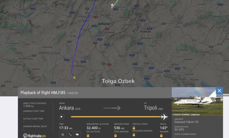 Ankara Esenboğa’dan Libya’da Trablus’a gitmek üzere kalkan 9H-DFS tescilli uçağın son dakikalarında izlediği rota belli oldu.