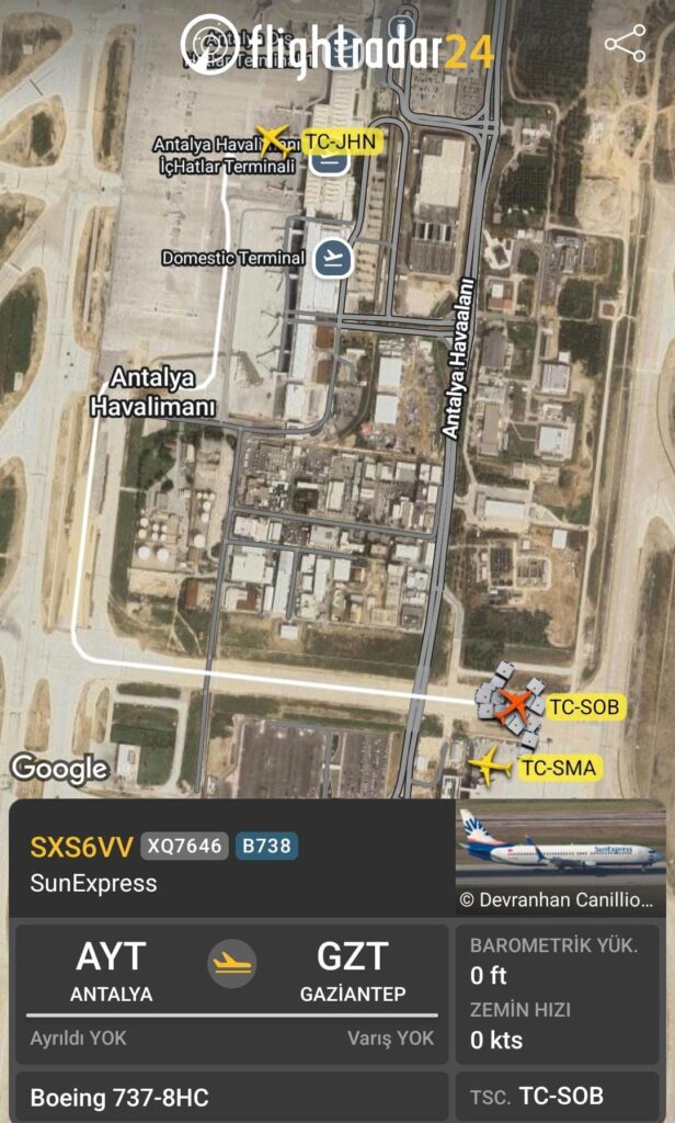 “Antalya–Gaziantep seferini yapmaya hazırlanan XQ7646 uçuş numaralı SunExpress uçağının taksi sırasında iniş takımı dikmesinde teknik bir arıza meydana gelmiştir.