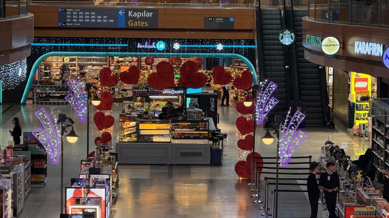 Sabiha Gökçen Havalimanı’nda dış hatlarda bulunan duty free-gümrüksüz satış mağazaları, yaklaşan Sevgililer Günü için özel bir tasarımla yolcuların karşısına çıkıyor.
