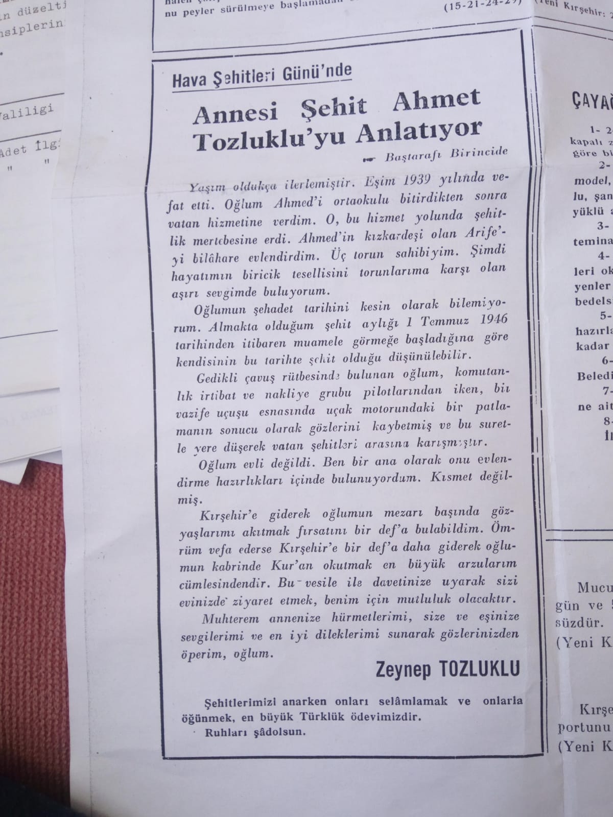 Zaynep Tozluklu, Sadık Torun’un mektubuna cevap vemişti. Sadık Torun bu mektubu bir başka Hava Sehitlerini Anma gününde, 15 Mayıs 1968 tarihinde Yeni Kırşehir gazetesinde yayınlamıştı. Az sonra okuyacağınız satırlar Zeynep Tozluklu’nun oğlu hakkında yazdıklarıdır: